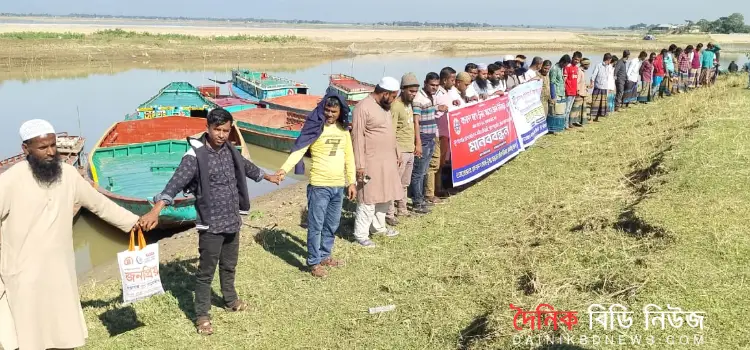 সুনামগঞ্জের নদী পথে অতিরিক্ত টোল আদায়ের নামে চাঁদাবাজী ও শ্রমিক নির্যাতনের প্রতিবাদে মানববন্ধন