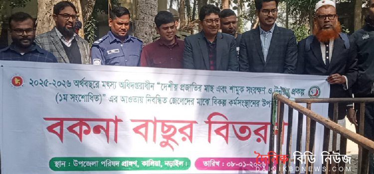 নড়াইলের কালিয়া উপজেলায় প্রান্তিক জেলেদের বিকল্প কর্মসংস্থান সৃষ্টির লক্ষ্যে গরু বিতরণ করা হয়েছে। উপজেলা মৎস্য অফিসের উদ্যোগে ২০২৫–২০২৬ অর্থবছরে “দেশীয় প্রজাতির মাছ ও শামুক সংরক্ষণ ও উন্নয়ন প্রকল্প”-এর আওতায় নিবন্ধিত জেলেদের মাঝে এসব গরু (বকনা বাছুর) বিতরণ করা হয়।
