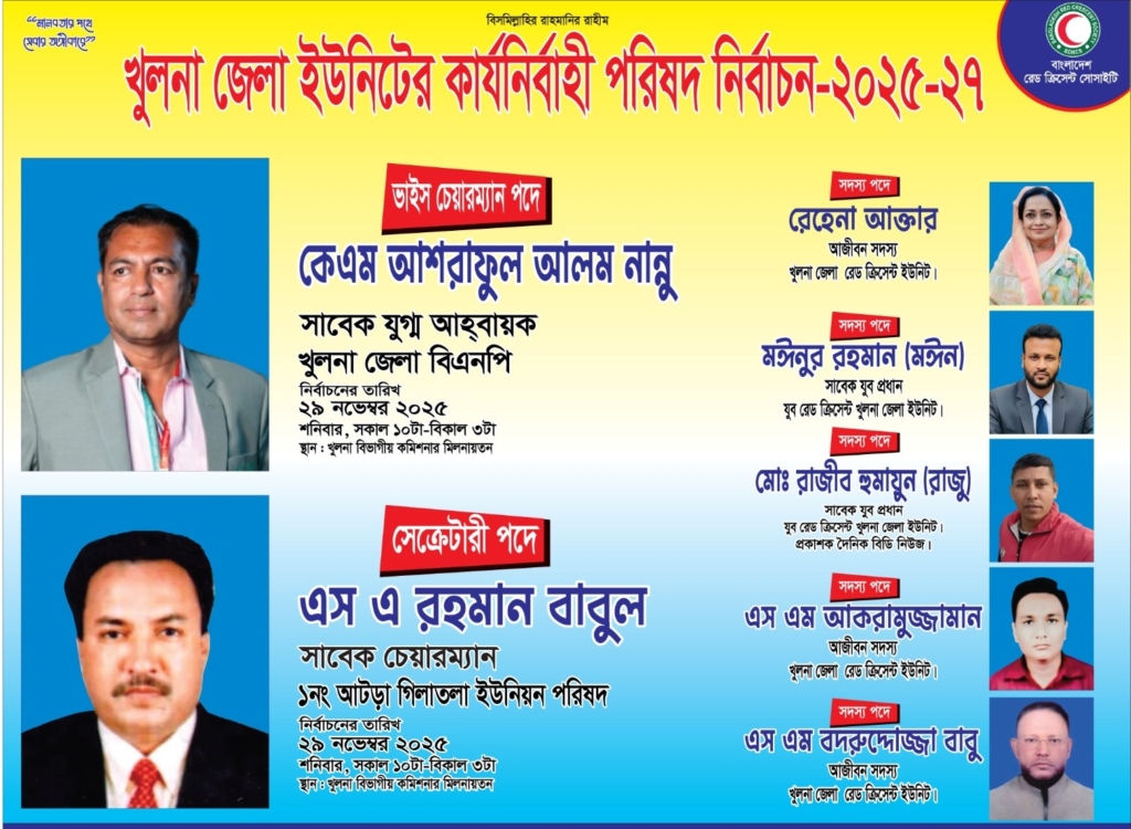 বাংলাদেশ রেড ক্রিসেন্ট সোসাইটির – খুলনা জেলা ইউনিটের কার্যনির্বাহী পরিষদ নির্বাচন ২০২৫–২৭ অনুষ্ঠিত হবে আগামী ২৯ নভেম্বর ২০২৫, সকাল ১০টা থেকে বিকাল ৩টা পর্যন্ত। ভোটগ্রহণ অনুষ্ঠিত হবে খুলনা বিভাগীয় কমিশনার মিলনায়তন-এ।
